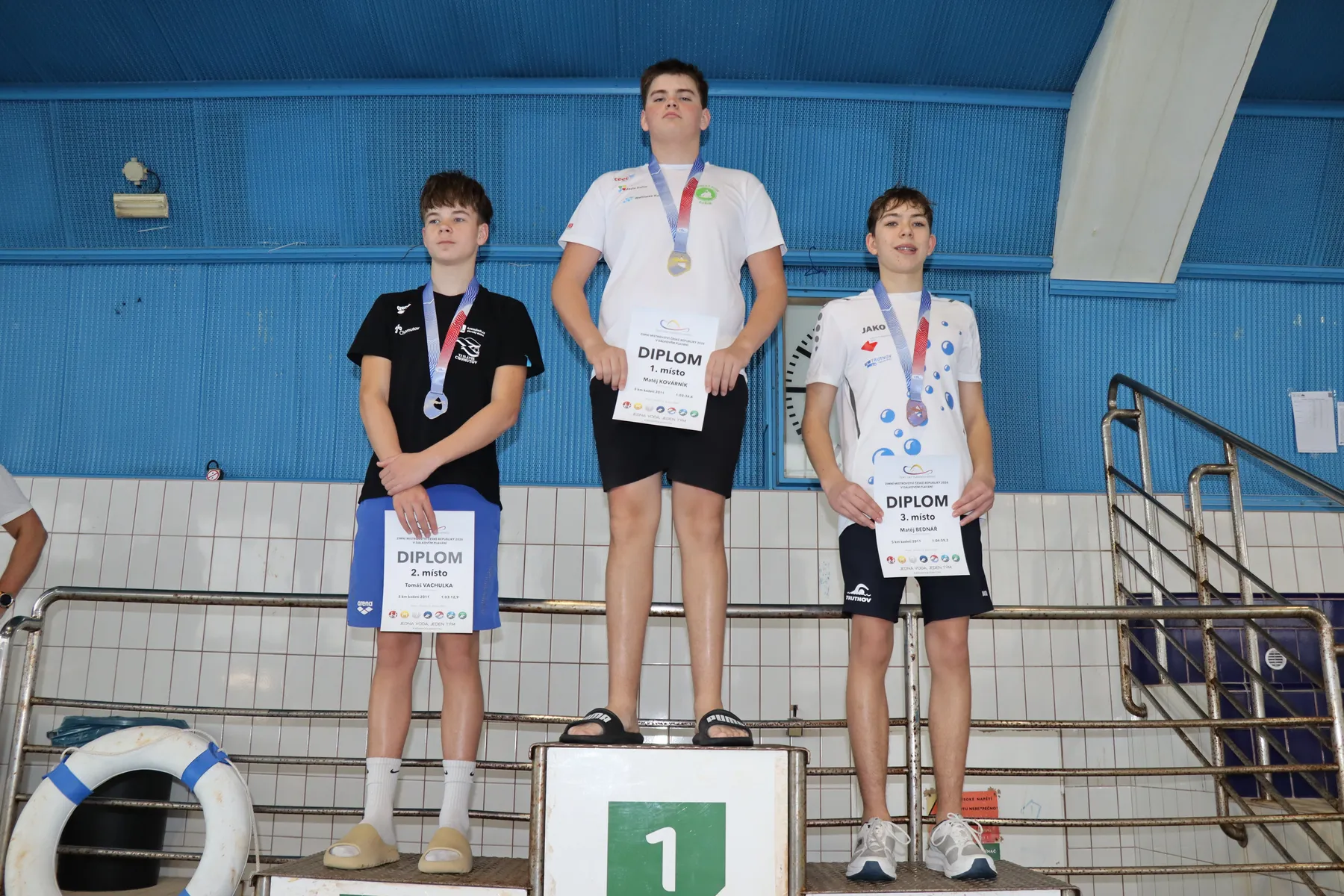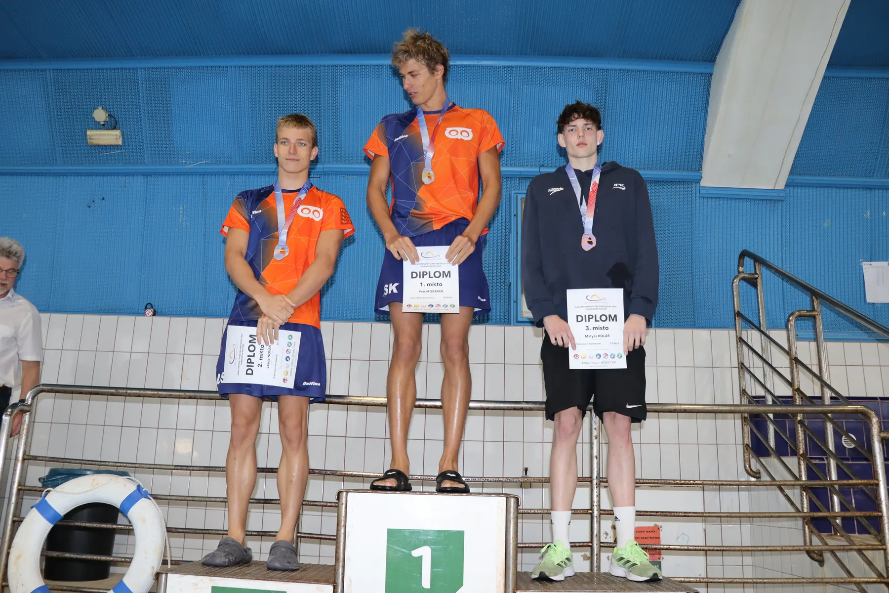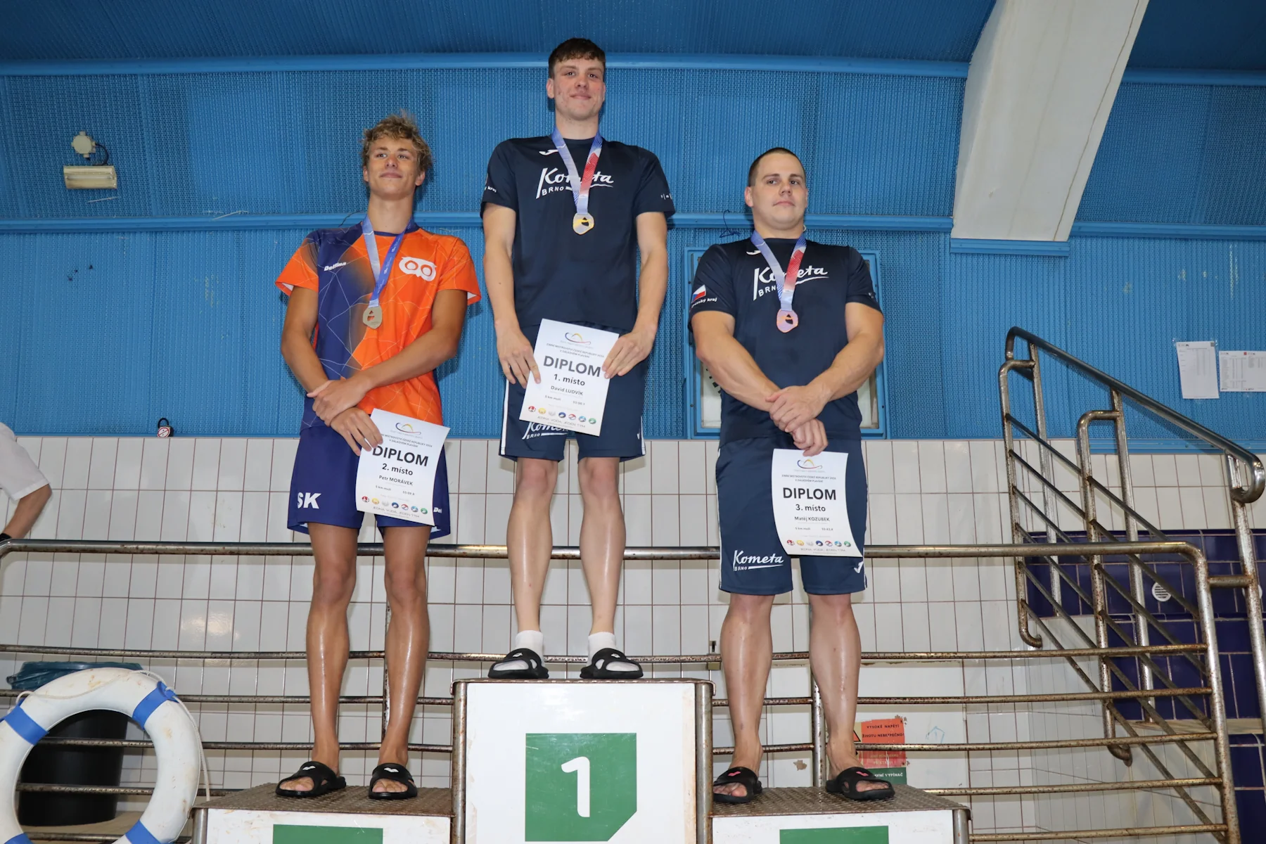Velký příběh zažili přítomní diváci, trenéři a plavci i v závěrečné rozplavbě mužů. Na jedné dráze se společně sešla dvojice David Ludvík a Petr Morávek, kteří všem přítomným připravili opravdu zajímavý zážitek. Společně, prakticky celou dobu bok po boku, totiž absolvovali skoro celých pět kilometrů. Vteřinové pokusy o únik jednoho ten druhý vždy pečlivě pokryl, a tak se muselo rozhodnout až v závěrečných stovkách metrů. V těch měl přeci jen více sil i zkušeností David Ludvík (Kometa Brno), který si ve výborném čase 55:00.1 dohmátl pro mistrovský titul a ostrý limit na Mistrovství Evropy. Devět vteřin za ním pro stříbro, titul mezi starším dorostem a také ostrý limit na ME finišoval Petr Morávek (USK Praha), bronz a měkčí limit na ME pro sebe uzmul Matěj Kozubek (Kometa Brno). Stupně staršího dorostu doplnili Jakub Novák (USK Praha) a Matyáš Kolář (Jihlavský PK). Mezi mladším dorostem zvítězil Ondřej Černohous (USK Praha), stříbro bral Šimon Studnička (Slávie Chomutov), bronz Jiří Zátopek (Kopřivnice).
