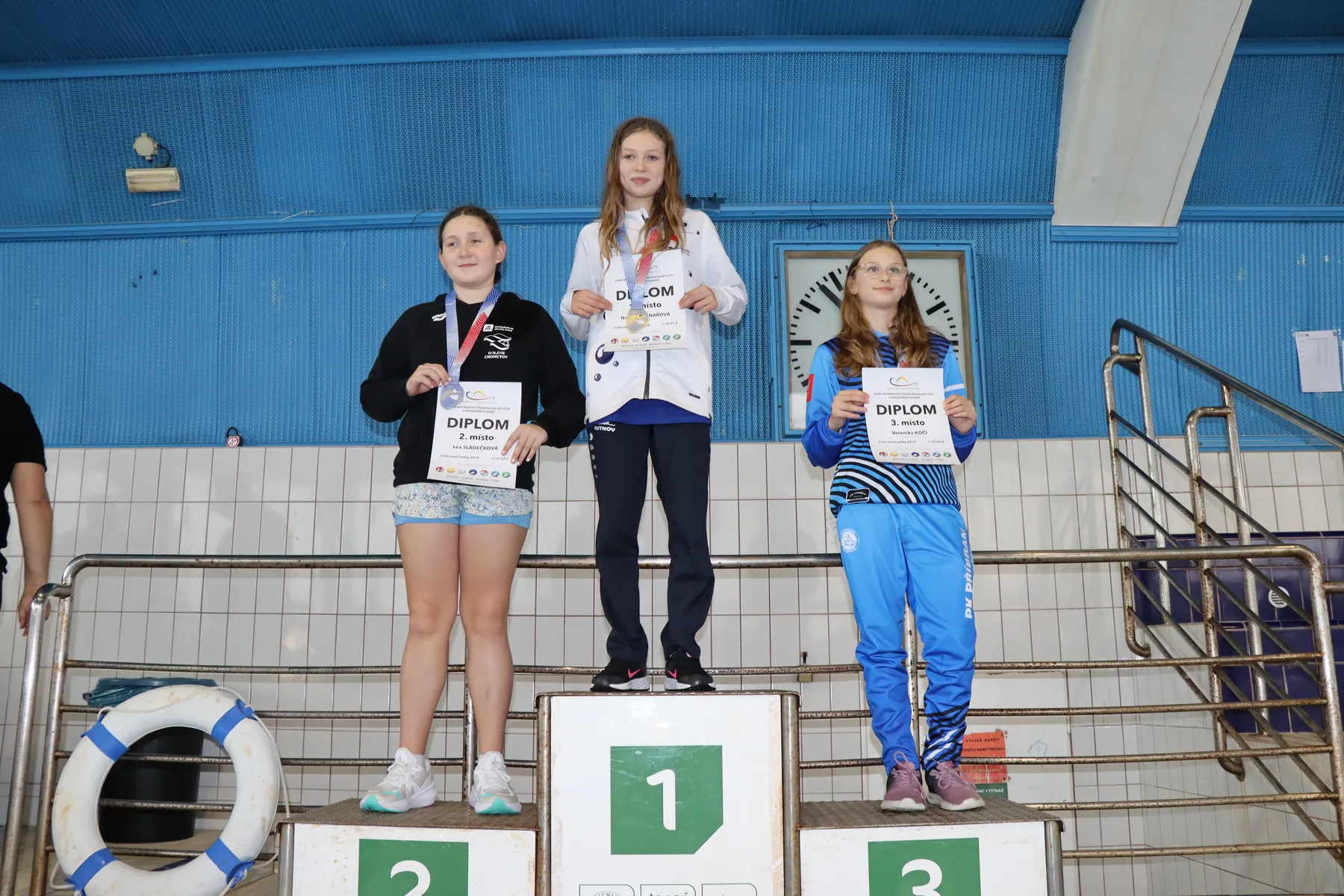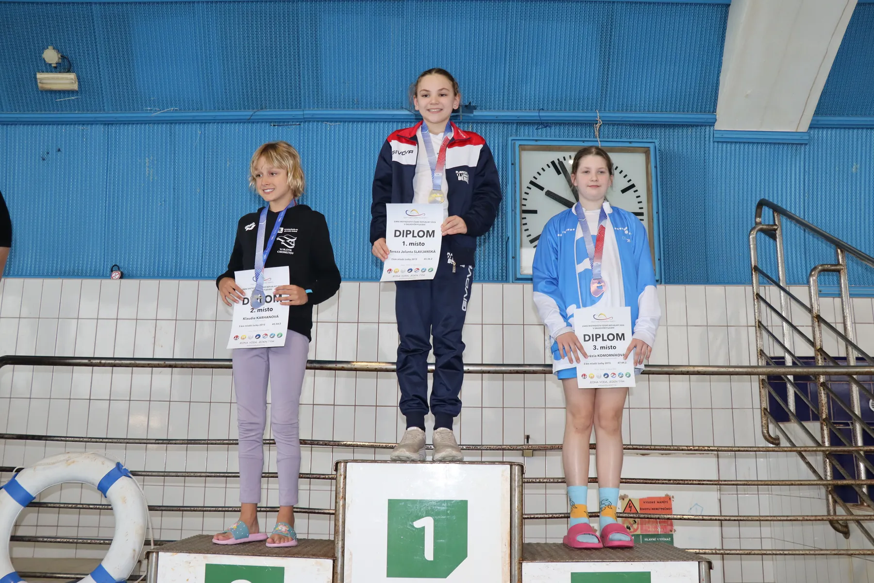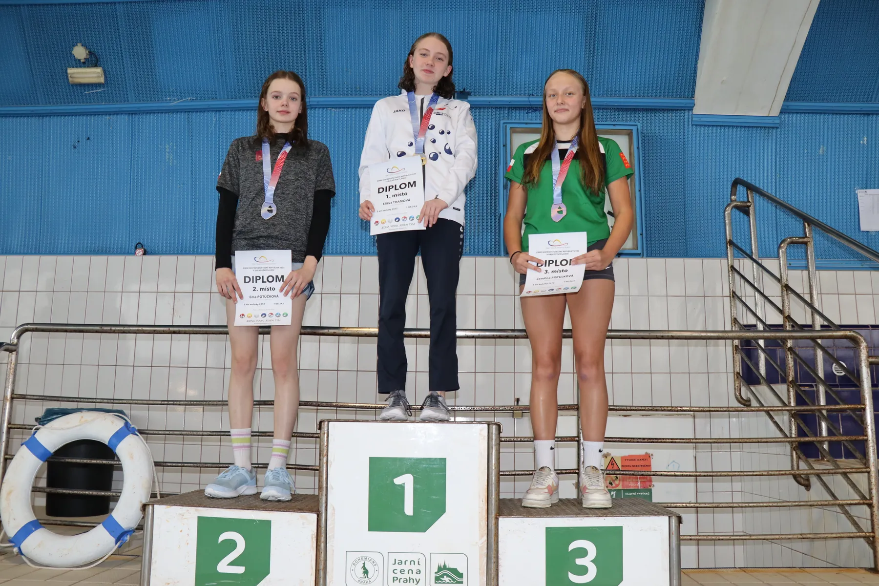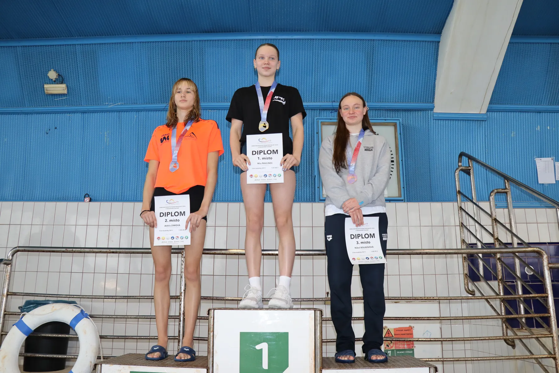 V závodě žen zářilo od začátku jediné jméno. Julie Pleskotová (USK Praha), po loňské sezóně strávené v rámci World Aquatics Scholarship Programme ve Francii, trénuje od září opět „doma“ právě v Podolí, závěrečnou přípravu na šampionát absolvovala v egyptském Soma Bay, kde si tréninkově prodloužila pobyt po závodě Světového poháru, a v neděli v jejím podání vše přesně zapadlo do sebe. Od startu plavala na čele, když už po prvním kilometru otáčela téměř s patnáctivteřinovým náskokem na nejbližší pronásledovatelky, a v cíli z toho byl nakonec výborný čas 59:33.8, titul Mistryně ČR, nový osobní rekord a splněný ostrý limit pro start na letošním Mistrovství Evropy v Paříži. Na stupně vítězů ji doprovodily vítězky dorosteneckých kategorií – stříbrná Zuzana Bláhová (USK Praha), která zároveň ovládla mladší dorostenky, a bronzová Lucie Netrefová (Kometa Brno), vítězka starší dorostenek. Zbývající medaile mezi mladšími dorostenkami získaly druhá Kateřina Zimová (Ústecká Akademie PS) a třetí Mia Srbová (Bohemians Praha), mezi staršími dorostenkami pak Hana Jurčáková (Bohemians Praha) a Aneta Štěpánová (KPS Ostrava).